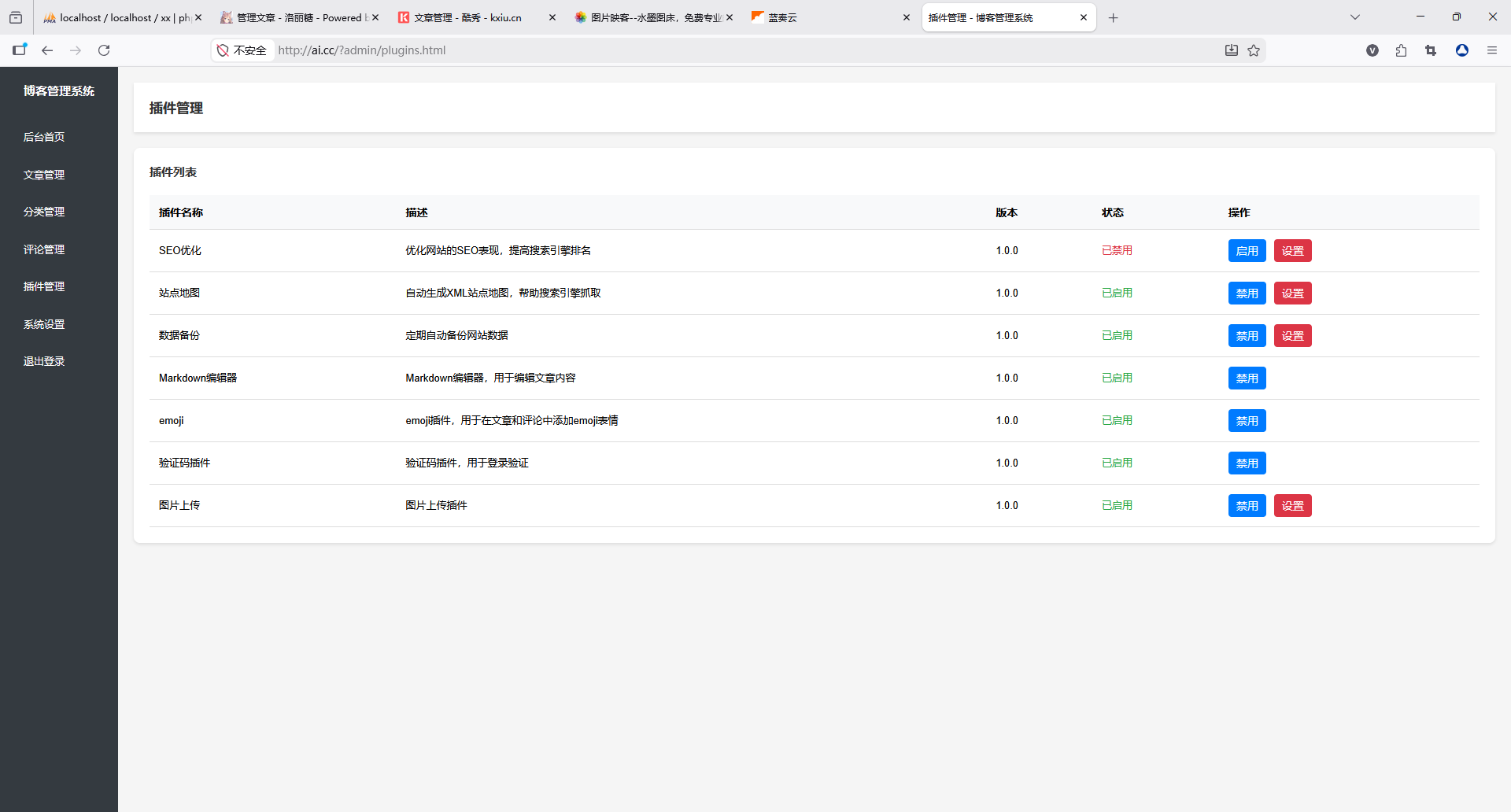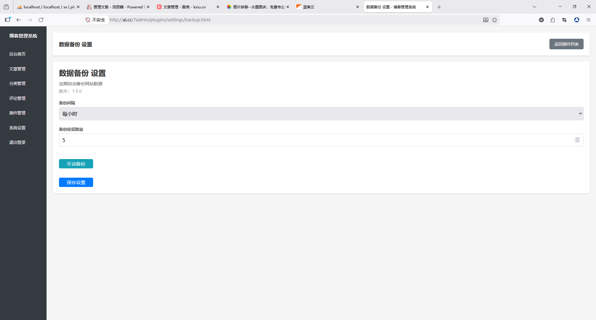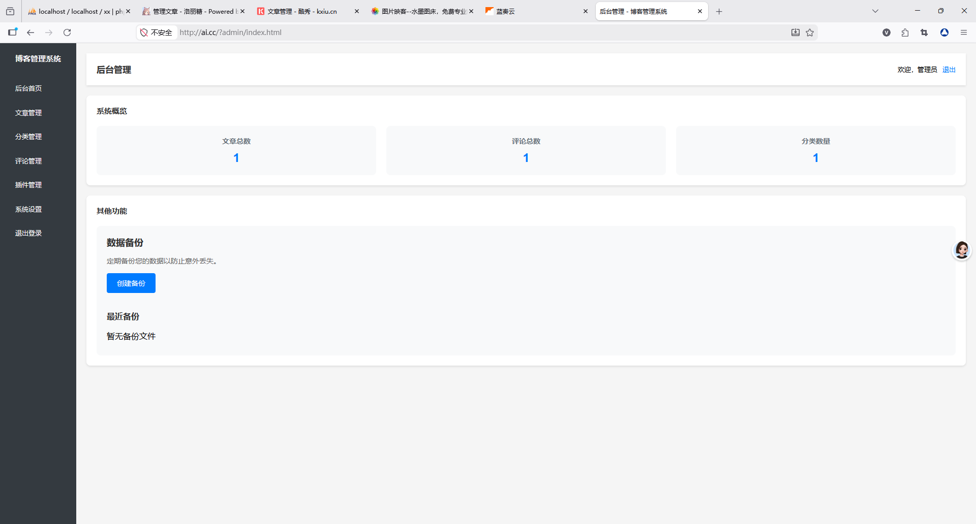 仪表盘直观展示文章总数、评论总数、分类数量;支持数据备份功能,保障数据安全;同时可配置系统设置、管理插件,灵活扩展功能。