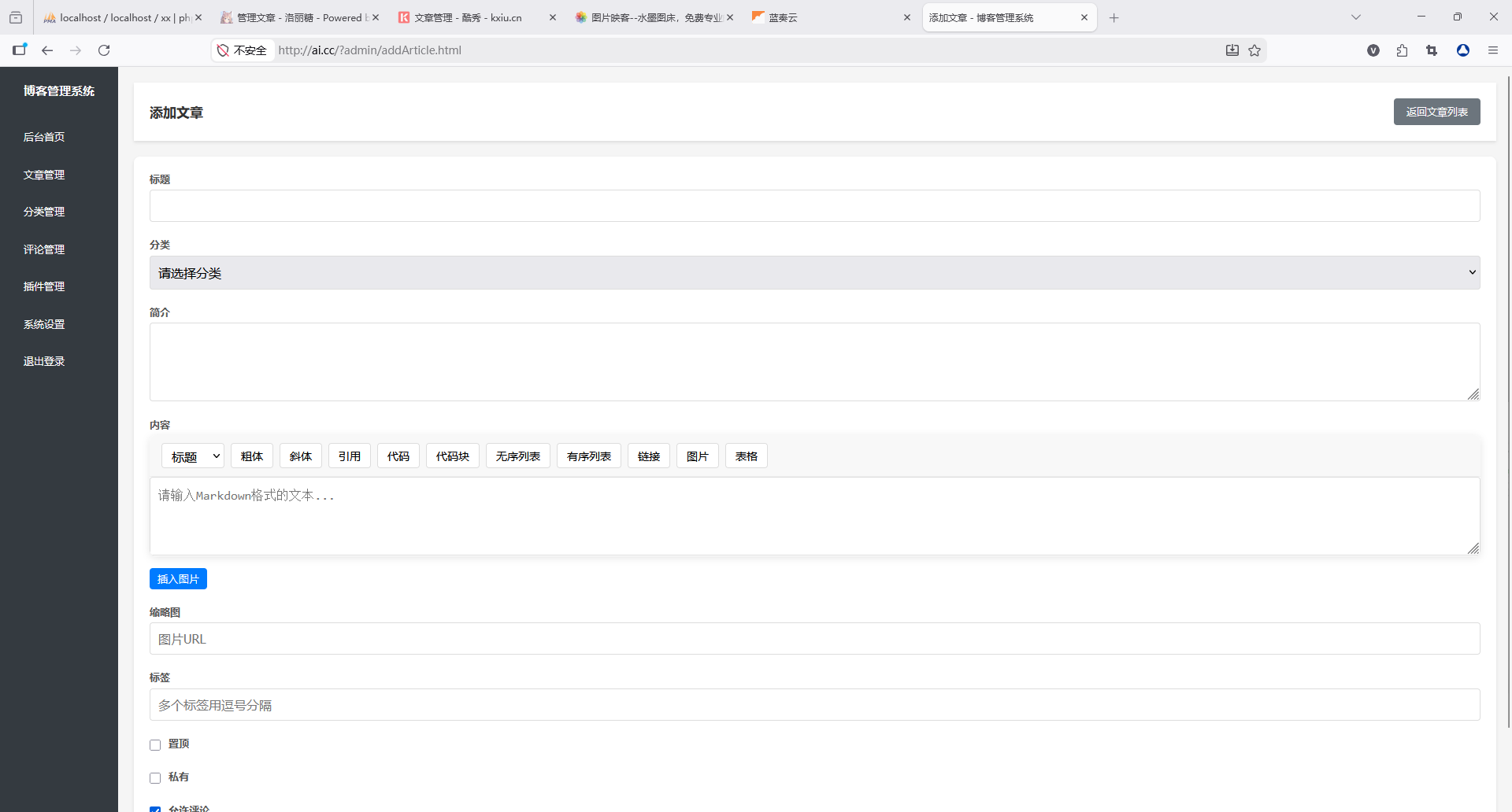 文章管理:支持新建、编辑、删除文章,可设置置顶、私有、开启评论,自带 Markdown 编辑器与排版工具栏,轻松排版图文内容。