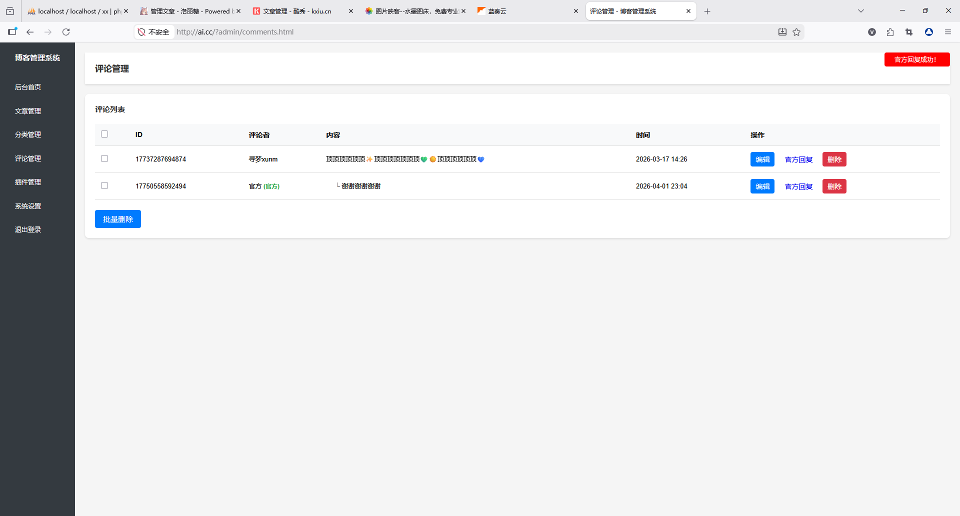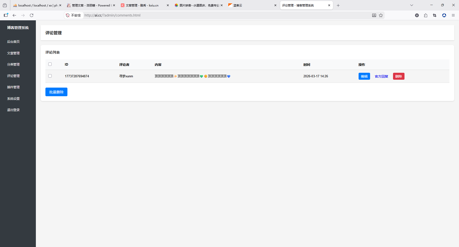 评论管理模块,可查看、审核、删除访客评论,维护社区氛围。